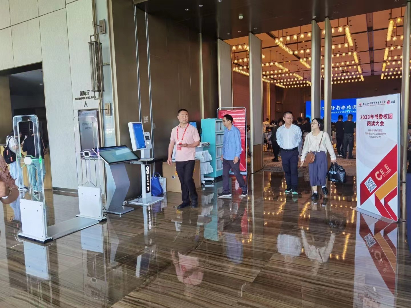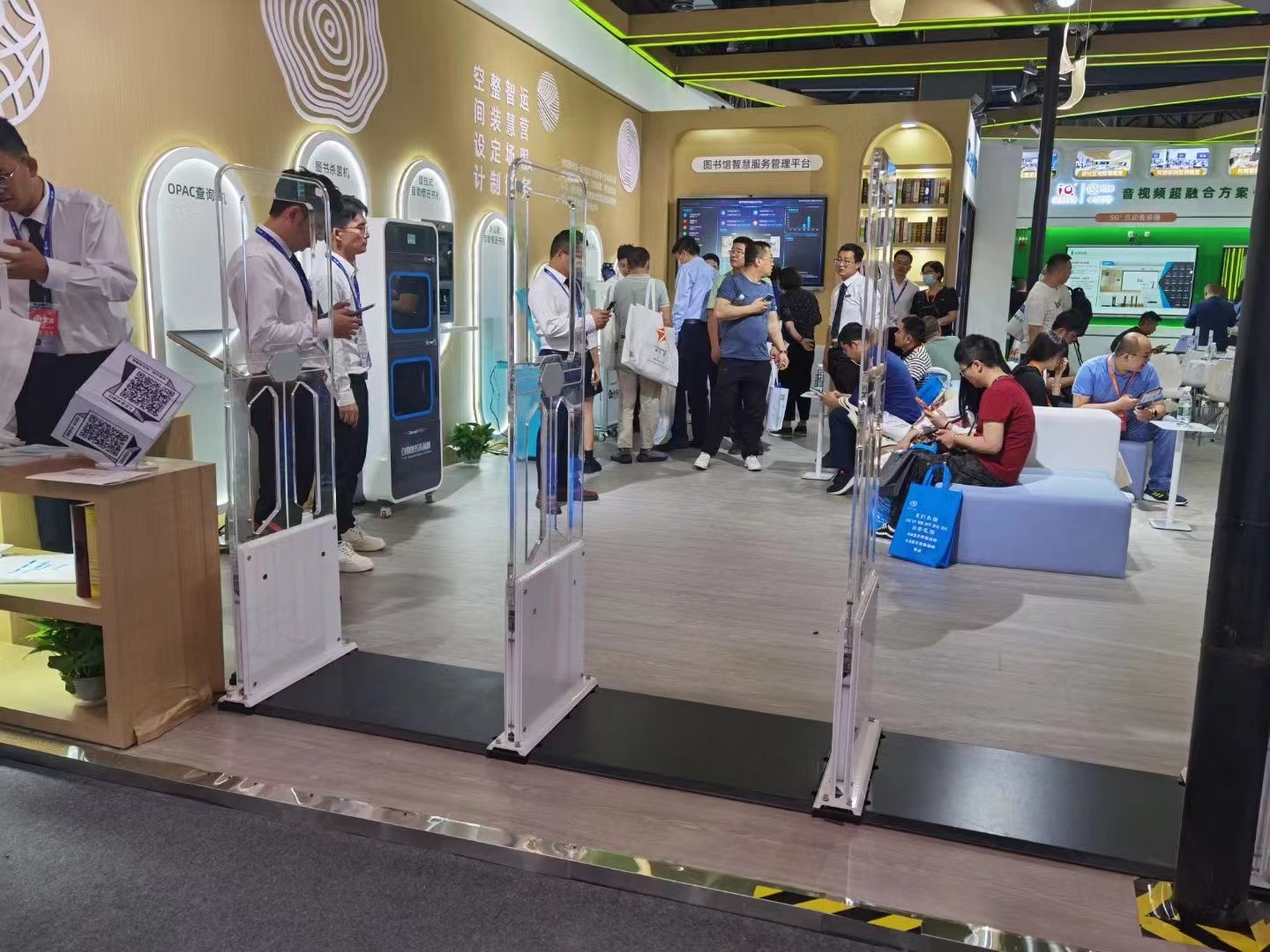 2023年4月21日,东芯助力南昌教育装备展,RFID微型图书柜,自助借还书机,馆员工作站,智能盘点书车,查询检索机,图书安全门禁,人山人海,红红火火。